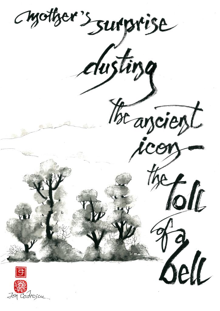 Ion Codrescu’s haiku: mother’s surprise/ dusting the ancient icon—/ the toll of a bell