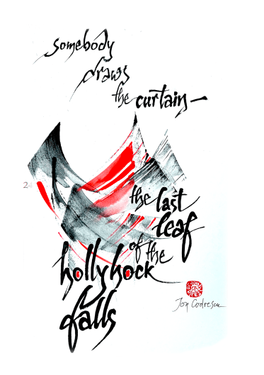 Ion Codrescu’s haiku: somebody draws the curtain—/ the last leaf of the hollyhock/ falls