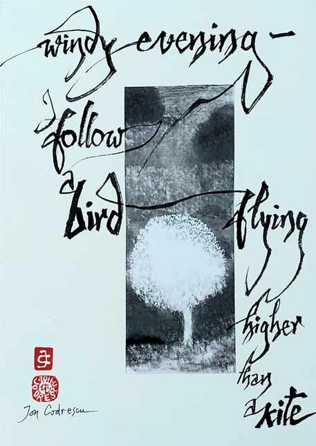 Ion Codrescu’s haiku: windy evening—/ I follow a bird flying/ higher than a kite